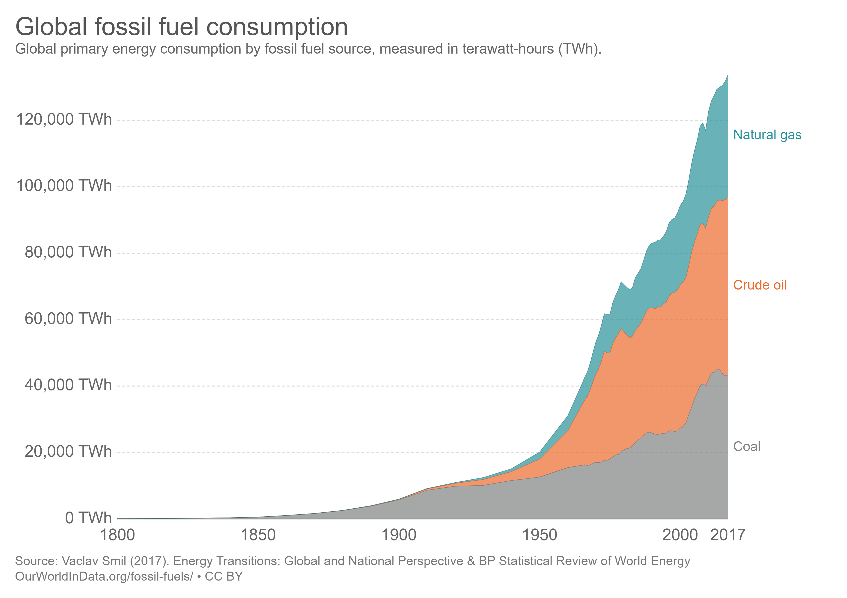 It is hard to overstate the importance of energy to modern man. One can hardly conceive of life without it. It powers our transportation, heats and cools our homes and offices, lights our cities, provides the energy to power home appliances and also makes large scale industrial operations possible — enabling whole sections of the economy that would otherwise not exist. Indeed, the economic transformation witnessed in the late 1800s in no small part reflects a revolution in energy. And fossil fuels where at the center of this energy revolution. The potential for coal to power steam engines and do mechanical work was realised first with oil later entering the mix to become the primary fuel for transportation. Natural gas was the last fossil fuel to be tapped in a significant way for its uses in residential and industrial heating as well as electricity generation. Since the Second World War consumption has surged virtually exponentially in all three major fossil fuel groups accompanying a dramatic uptick in global economic activity.